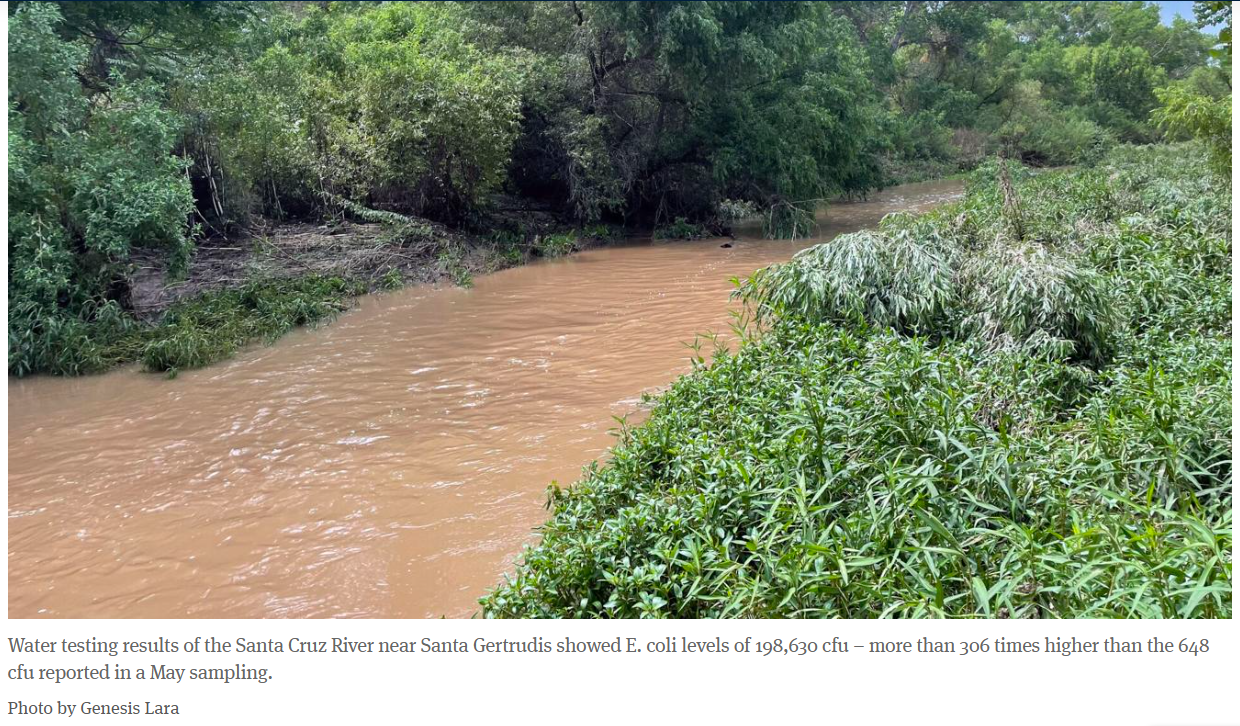 The highest E. coli levels, registered from the sample at the Nogales Wash, recorded 241,960 mpn (most probable number) per 100 ml – about 975 times higher than the 248 mpn recorded at the same spot in May, Williams said. The sampling in Rio Rico yielded E. coli levels of 198,630 mpn following the sewage spill in June, compared to May’s reading of 284 mpn. And the lowest E. coli levels among the group’s sampling was recorded at the Santa Gertrudis crossing with 198,630 mpn – still about 306 times higher than the 648 mpn reported in the group’s May sampling.